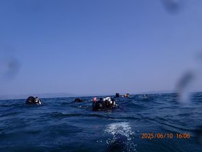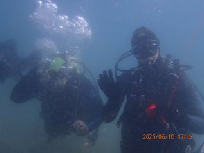 Am 10.06.2025 durften wir vormittags erneut den kontrollierten Aufstieg üben, allerdings aus etwas tieferer Tiefe (etwa 15m) und dann zwei Stops zum einpendeln auf 10m und 5m. Der Mittagstauchgang wurde für eine Art Zirkeltraining genutzt. Zunächst mussten wir mit unserer kompletten Ausrüstung knapp 250m in die angrenzende Bucht schnorcheln/schwimmen. Den ganzen Weg ging es natürlich auch wieder zurück. In der ursprünglichen Bucht (Seegurkenplantage ;)) angekommen haben wir wie jedes mal die Buddy-Checks durchgeführt und dann in zweier Teams einmal die Rettung eines verunfallten Tauchers und das Boje setzen geübt.