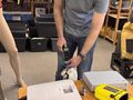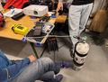 Danach ging es dann in Gruppe 3 zu Martin und seinem Schneidewerkzeug. Ausgerüstet mit diversen Messern, Scheren und Linecuttern durfte Neopren zerschnitten werden, um zu sehen, wie man in einem Notfall den Verletzten am besten aus seinem Anzug bekommt. Das wurde beim Ärmel bevorzugt entlang der Hauptschlagader getestet, bis Martin die Befürchtung hatte, gleich selbst als Fallbeispiel zu Leon rüber zu müssen.