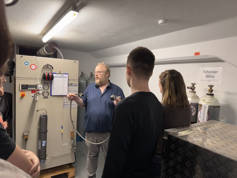 Begonnen wurde der Tag um 10 Uhr in Überlingen mit einer ausführlichen Einführung in die Druckkammer und den damit verbundenen Risiken wie Barotraumen und die Bedeutung des Druckausgleichs, sowie der Gegenstände die mit in die Kammer genommen werden dürfen. Baumwollkleidung ist hierbei von essentieller Bedeutung, wenn man nicht potentiell anfangen möchte zu brennen. Sonstige Gegenstände wie bspw. Schlüssel, Handys, Uhren und auch unsere Schuhe mussten draußen bleiben, entweder wegen Brandgefahr, oder aufgrund von irreversiblen Schäden, die bei dieser Fahrt entstehen könnten. Mit rein durfte jedochTrinken und Papier inklusive Bleistiften, um bei 6 bar Druck ein Paar Aufgaben zu lösen. Außerdem ging es um den Tiefenrausch und wie sich dieser äußern kann, mit Hinweisen darauf, was bei einem echten Tauchgang beachtet werden muss, um mit dem Partner keine allzu großen Risiken einzugehen. Wenn dieser z.B. einem Fisch etwas von seiner Luft anbietet, sollte definitiv und dringend wieder etwas aufgetaucht werden. Während sich die erste Gruppe mit ihrem Gruppenführer Flo bereit gemacht hat, um in diese Tiefen abzutauchen, hat es sich die andere Gruppe mit Golo als Gruppenführer im Raum bequem gemacht. In der Druckkammer gab es dann eine weitere Einführung bezüglich der Kommunikation nach außen sowie dem Verlauf der Fahrt und der Bedienung der Sauerstoffmasken, welche später Einsatz finden sollten.