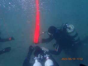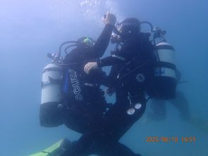 Am 10.06.2025 durften wir vormittags erneut den kontrollierten Aufstieg üben, allerdings aus etwas tieferer Tiefe (etwa 15m) und dann zwei Stops zum einpendeln auf 10m und 5m. Der Mittagstauchgang wurde für eine Art Zirkeltraining genutzt. Zunächst mussten wir mit unserer kompletten Ausrüstung knapp 250m in die angrenzende Bucht schnorcheln/schwimmen. Den ganzen Weg ging es natürlich auch wieder zurück. In der ursprünglichen Bucht (Seegurkenplantage ;)) angekommen haben wir wie jedes mal die Buddy-Checks durchgeführt und dann in zweier Teams einmal die Rettung eines verunfallten Tauchers und das Boje setzen geübt.